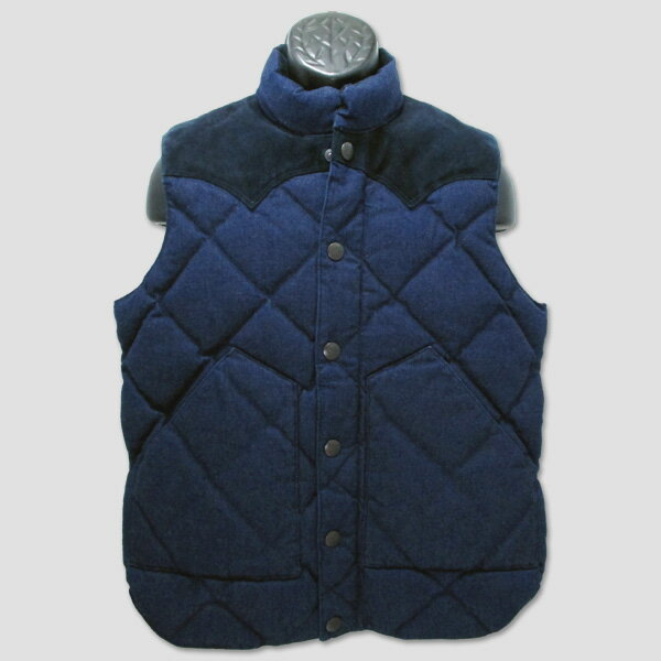 素材: 表地:綿100% ONE WASHED DENIM 肩ヨーク:牛革スウェード(NAVY)レザーヨーク 裏地:ポリエステル100%(クロ) 中綿:グースダウン80% フェザーダウン20% 前部はオリジナルスナップボタンとジッパーで風の進入をしっかりガード。